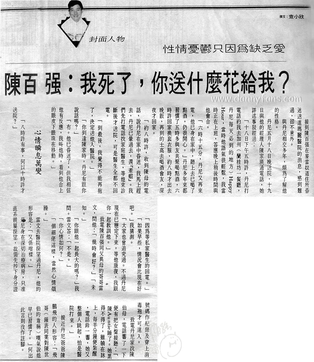 熟悉丹尼的朋友都认为他性格悲观,有自杀倾向,使我想起一次跟他倾电话,他忽然说:「小欣,我死了,你会送什么花给我?」