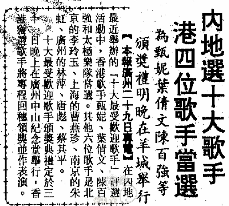 1991.08.30 內地選十大歌手港四位歌手當選為甄妮葉倩文陳百強等頒獎禮明晚在羊城舉行 大公報