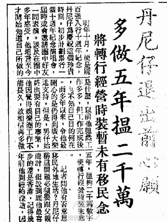 1988.11.06 丹尼仔退出前心願多做五年搵二千萬將轉行經營時裝暫未有移民念 華僑日報