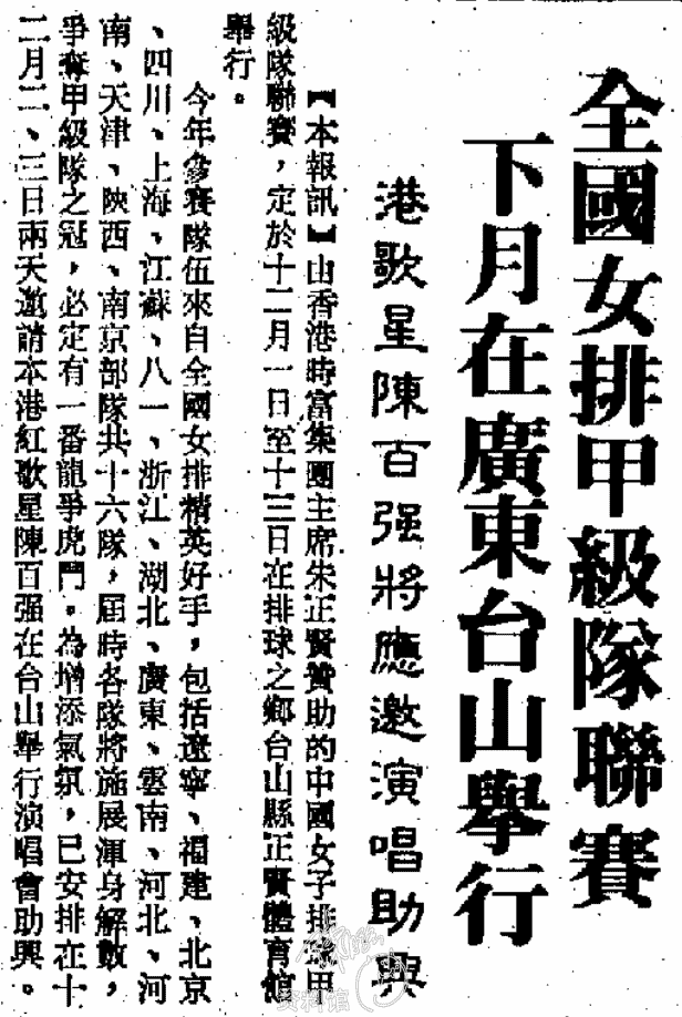 1988.11.16 全國女排甲級隊聯賽下月在廣東台山擧行港歌星陳百强將應邀演唱助興 大公報