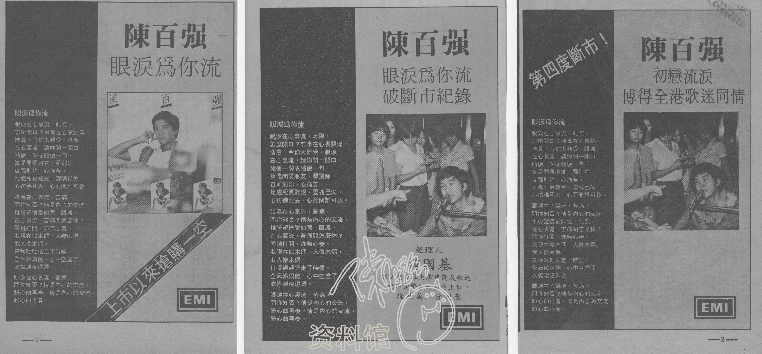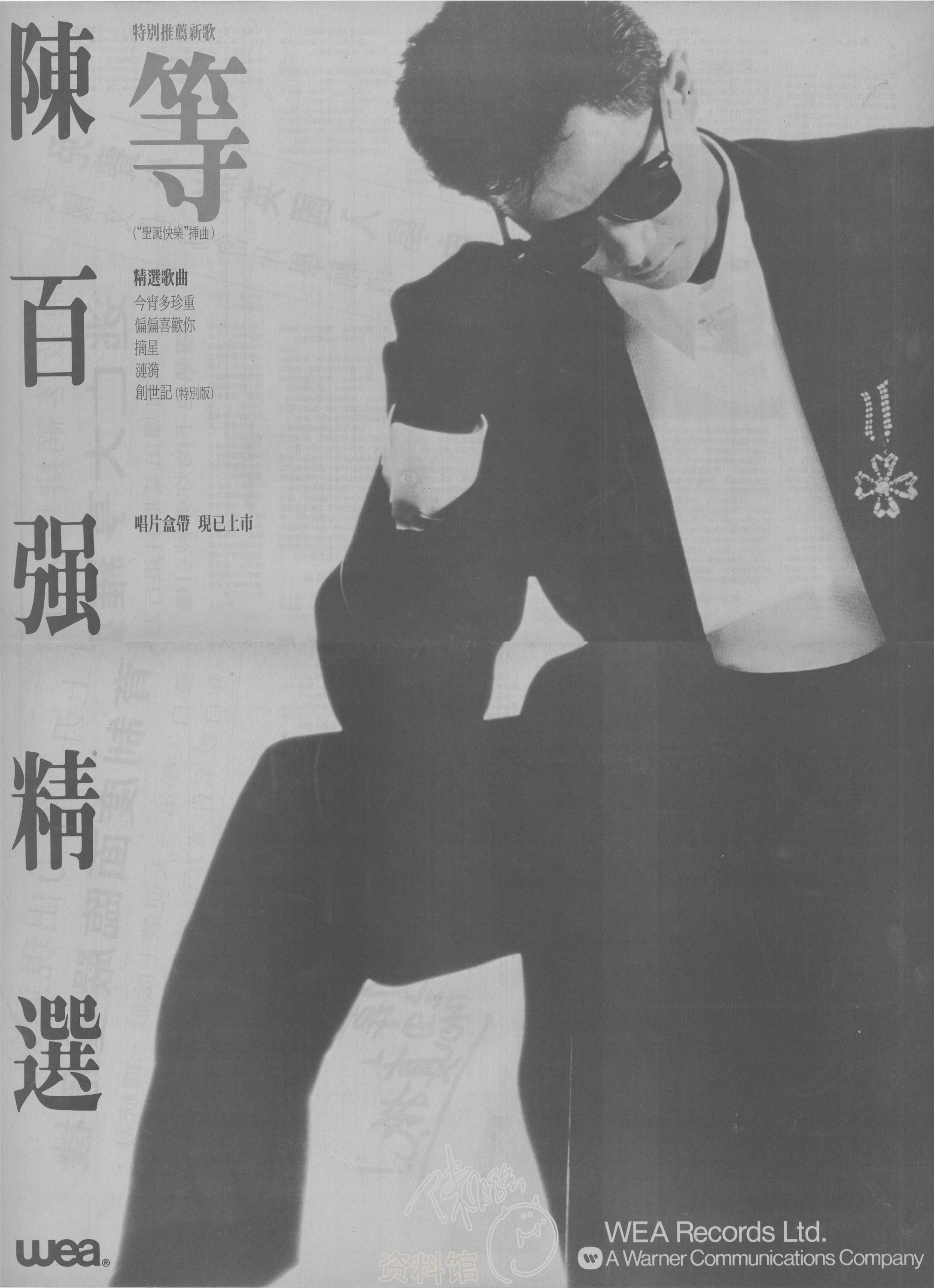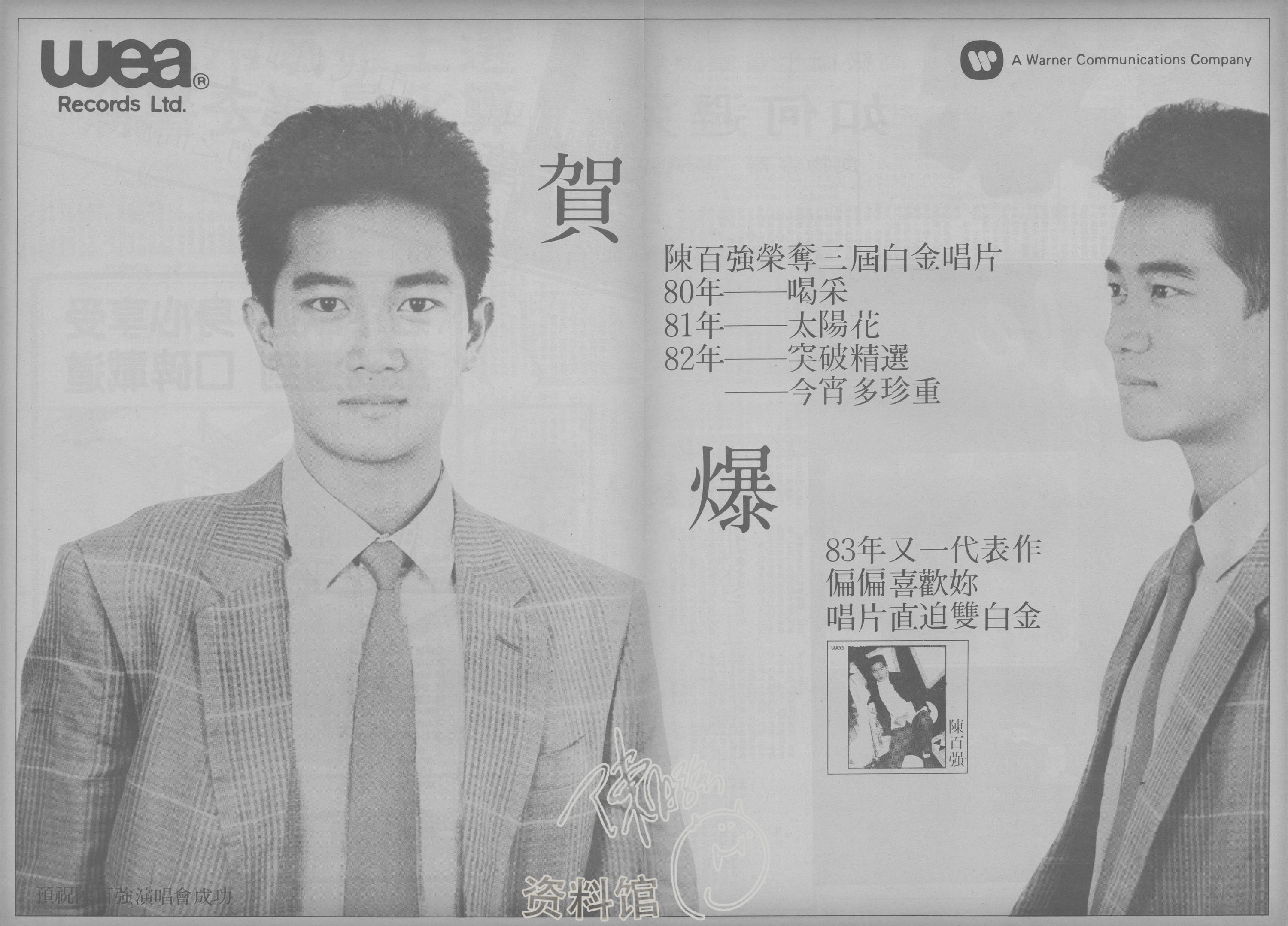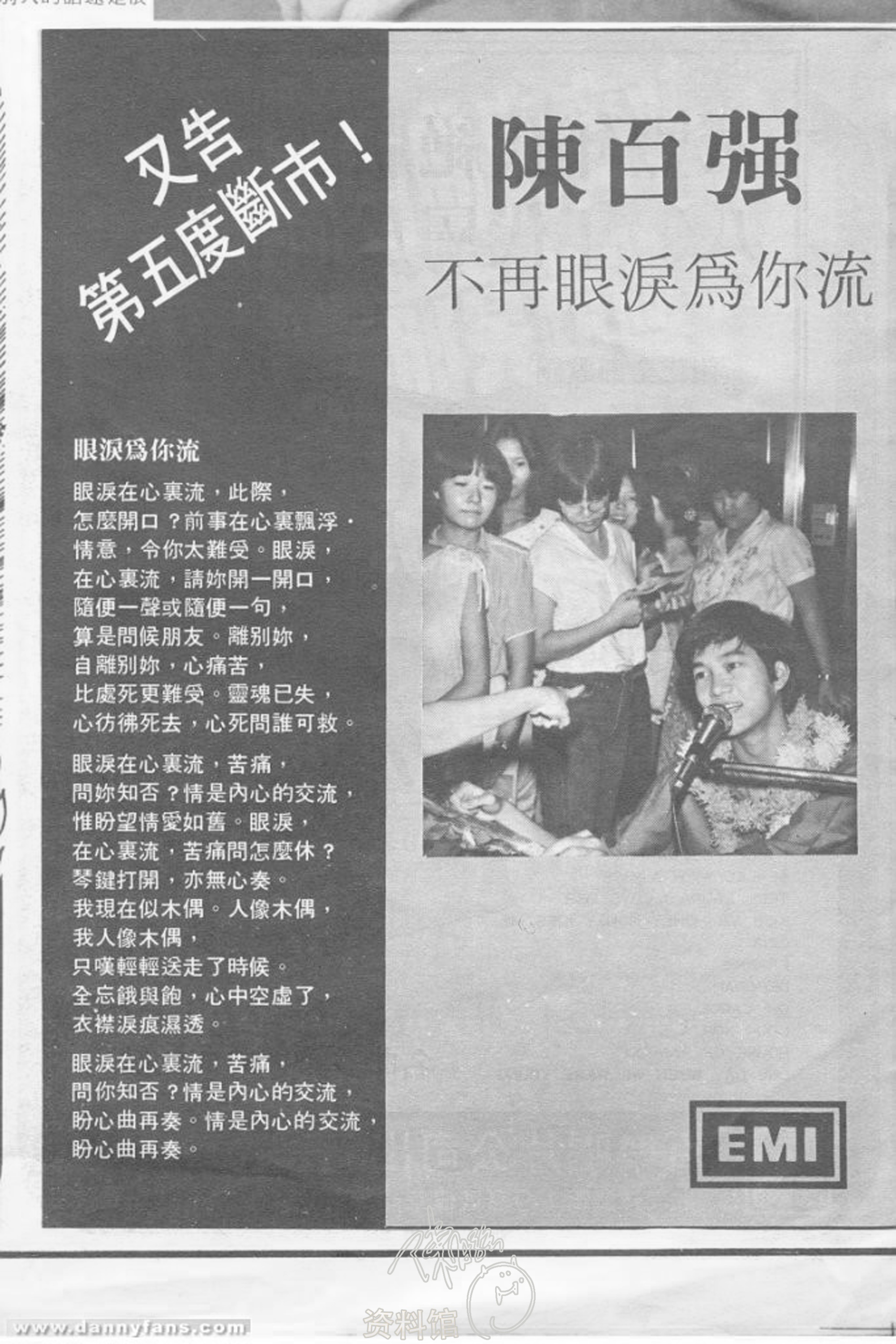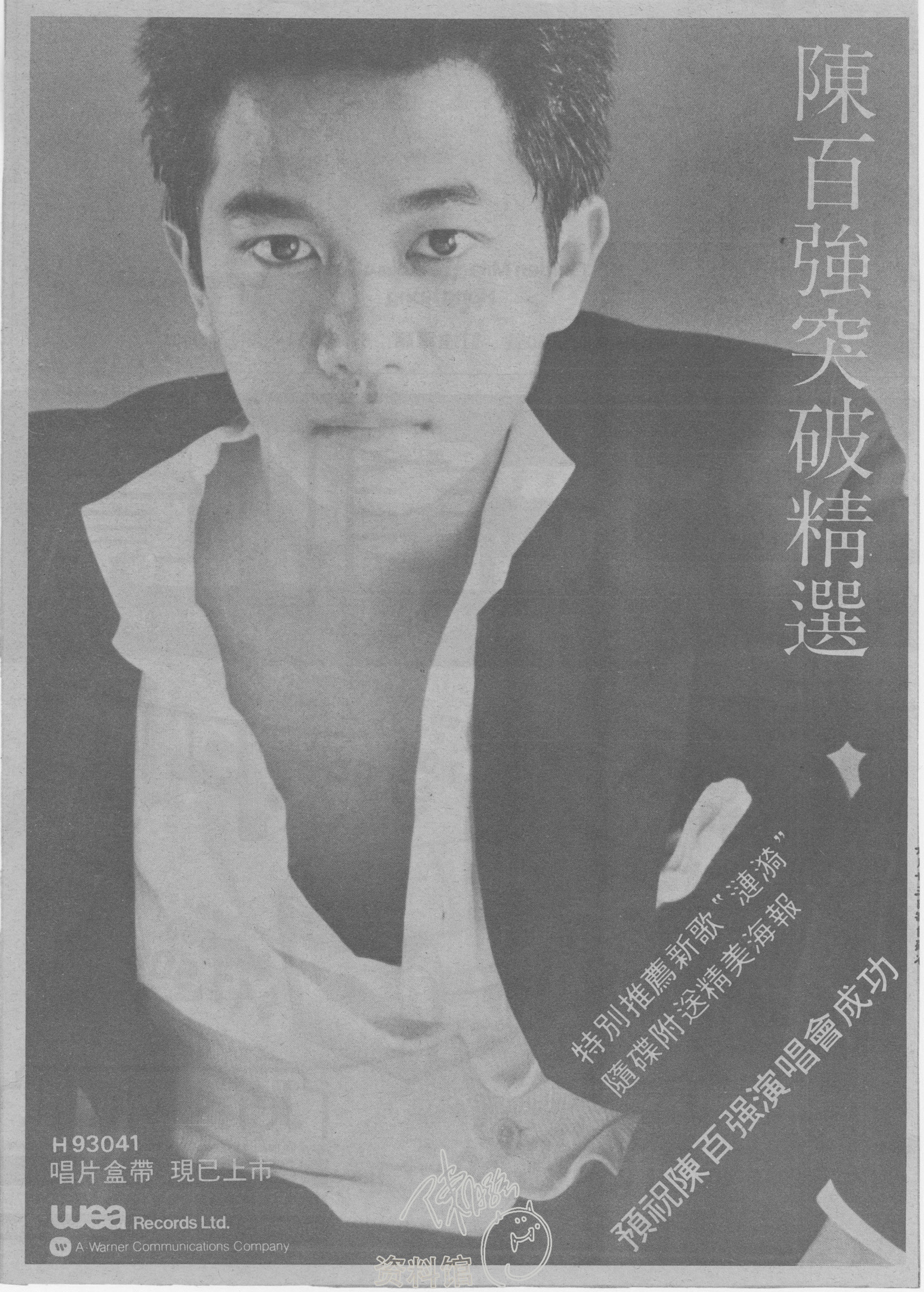 专辑上市宣传广告文件扫描:特别鸣谢MV、Kathy Lai Ho Yan。1979 眼泪为你流(First Love) 1980 山叶吉他大赛总决赛 1980 不再流泪 1980 几分钟的约会 1981 有了你、(电影:失业生) 1982 突破精选 1982 倾诉 1983 偏偏喜欢你 1983 陈百强演唱会 1984 电影 圣诞快乐 1984 百强‘84 1985 合唱曲目“再见Puppy Love” 相关文章:1 1985精选《等》 SONY DSC 页码: 1 2 3 4 5