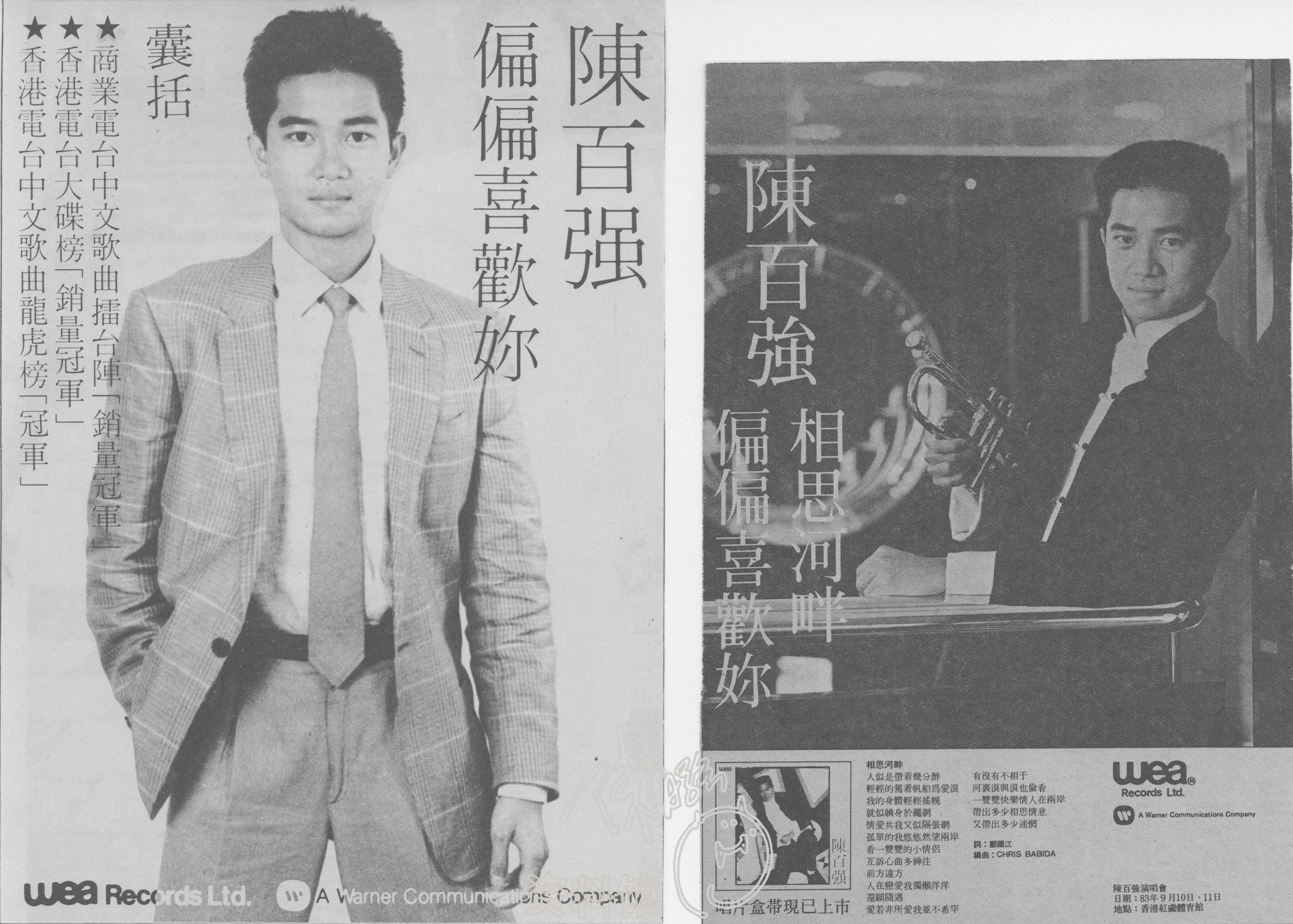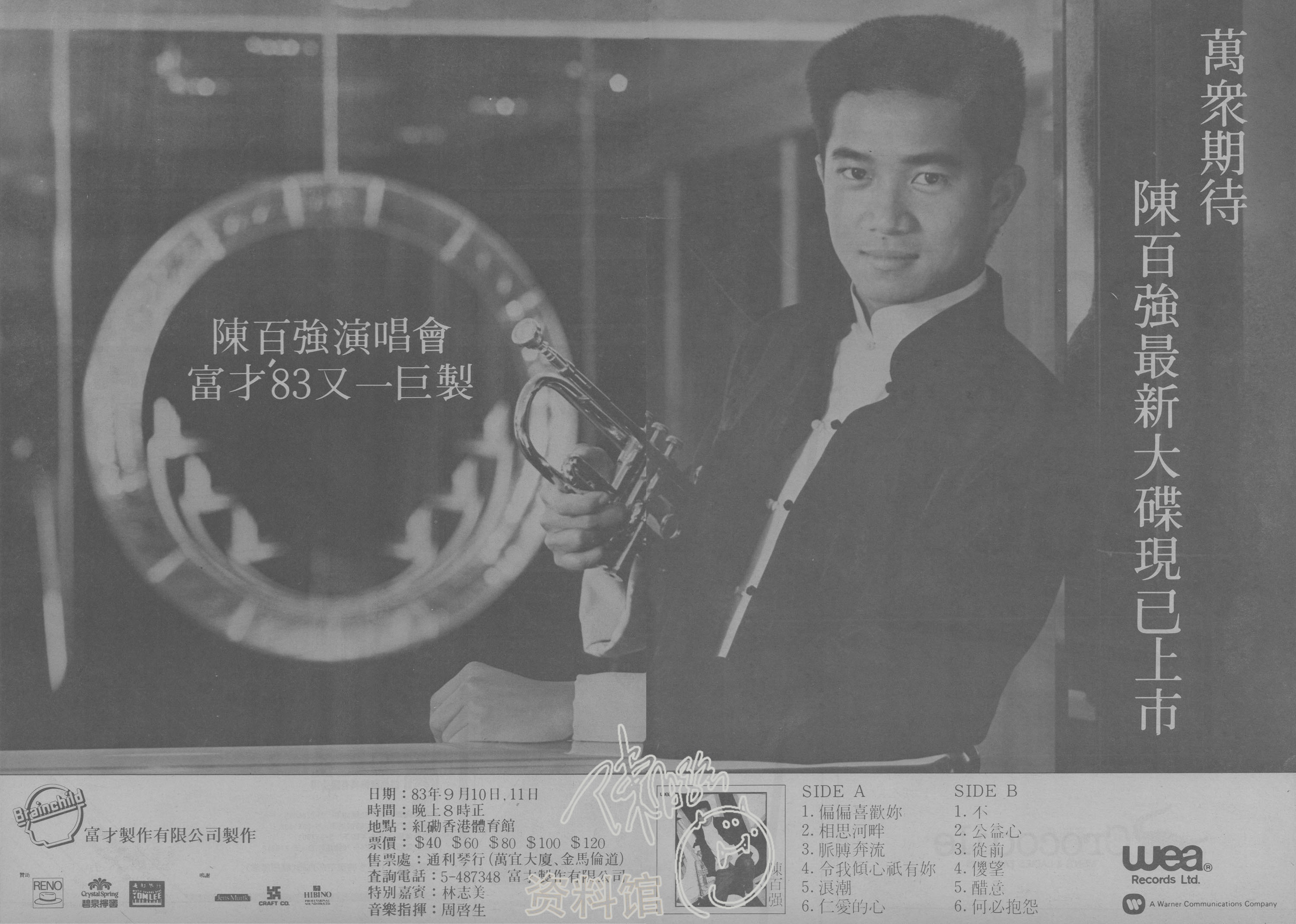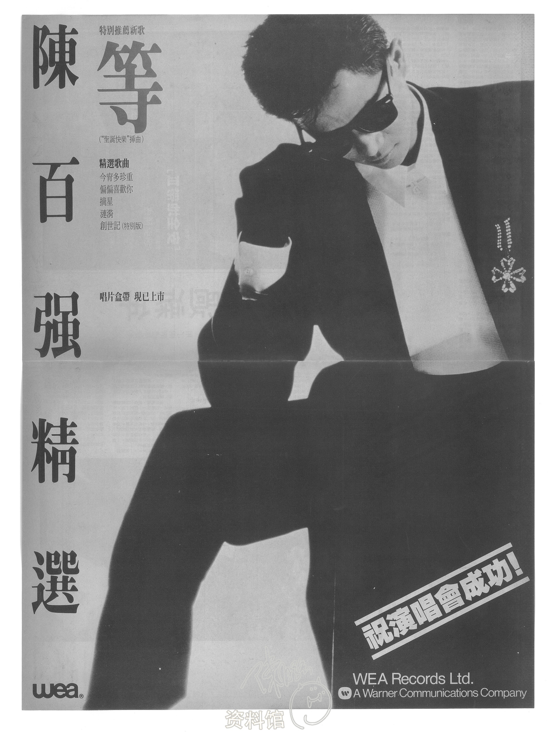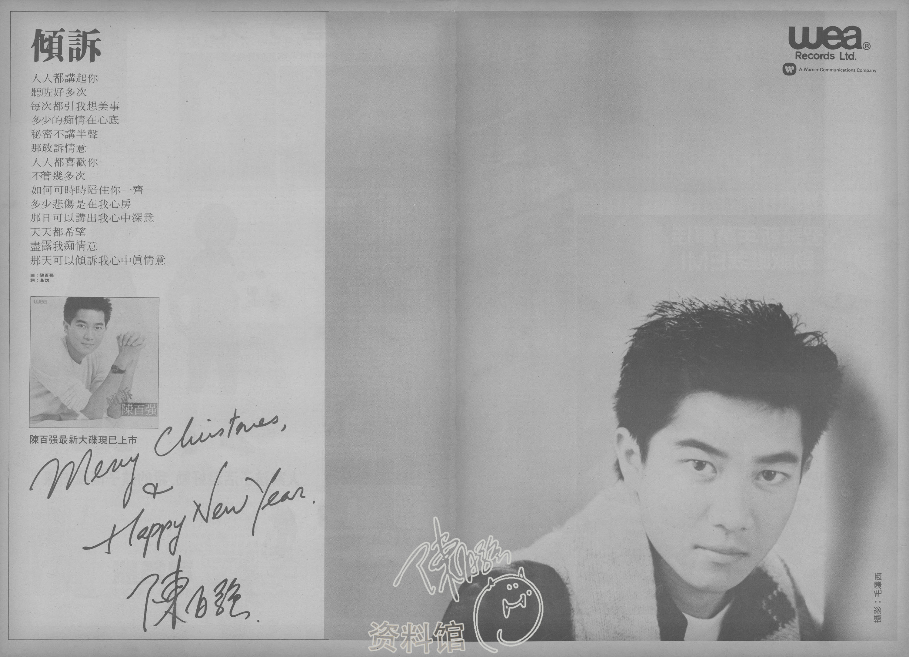 专辑上市宣传广告文件扫描:特别鸣谢MV、Kathy Lai Ho Yan。1979 眼泪为你流(First Love) 1980 山叶吉他大赛总决赛 1980 不再流泪 1980 几分钟的约会 1981 有了你、(电影:失业生) 1982 突破精选 1982 倾诉 1983 偏偏喜欢你 1983 陈百强演唱会 1984 电影 圣诞快乐 1984 百强‘84 1985 合唱曲目“再见Puppy Love” 相关文章:1 1985精选《等》 SONY DSC 页码: 1 2 3 4 5